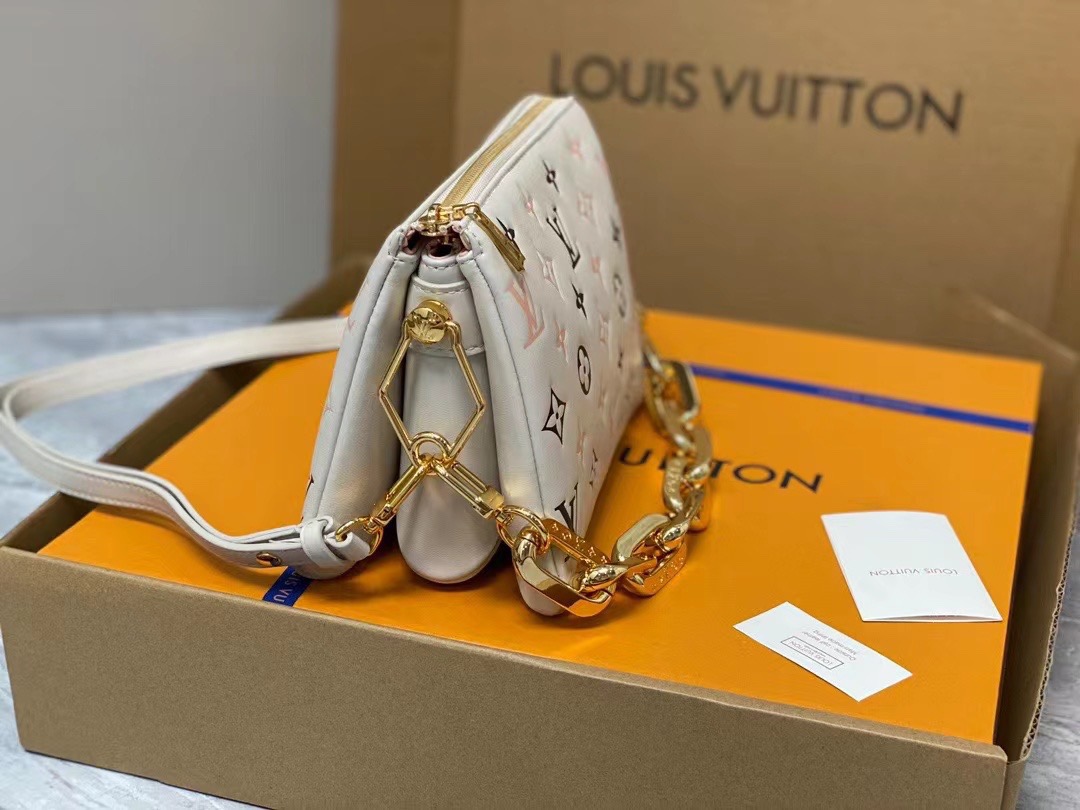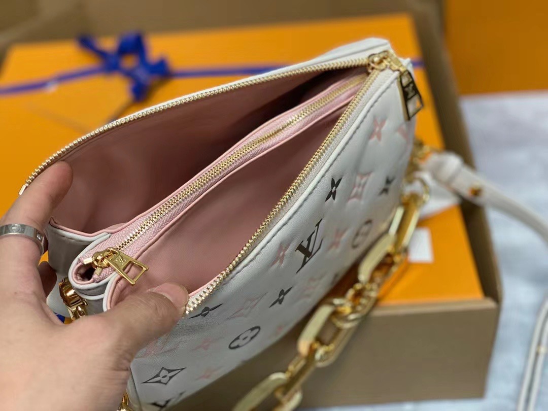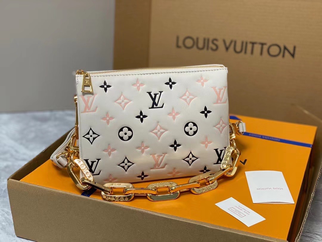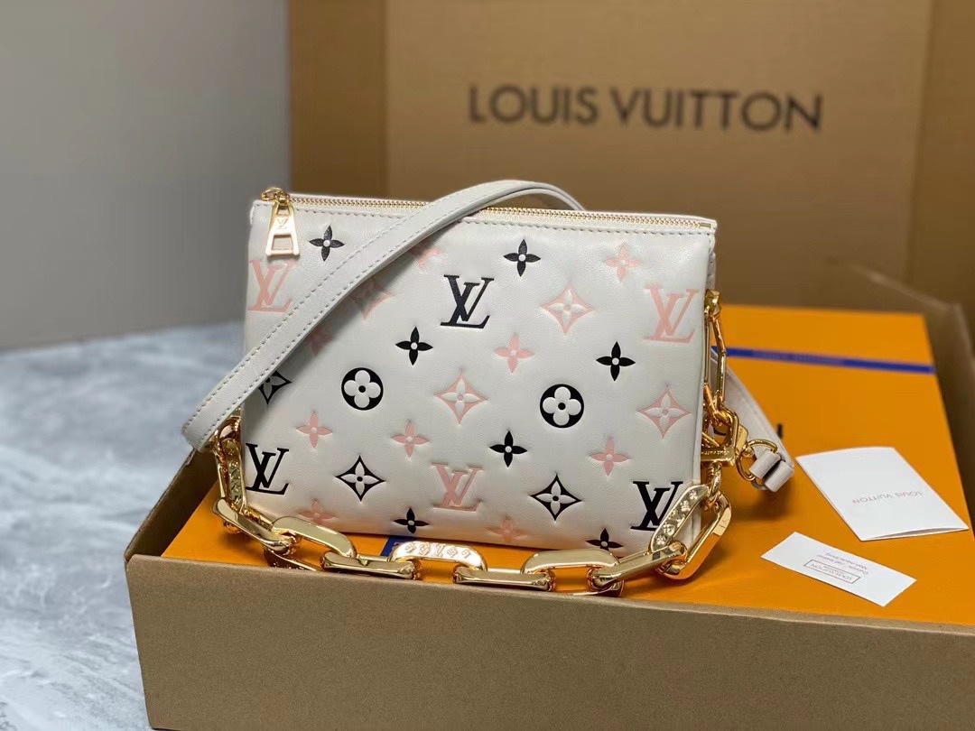 The new season in the P880 m22954 white full leather chain bag series, the Cousin bb handbag, the Cousin bb tricolor handbag, has emerged in soft colors this summer. Sheepskin leather is embossed with a Monogram pattern, woven into the chain by the pool of silk scarves, bringing a trendy atmosphere to your face. Removable and adjustable leather shoulder straps add styling options. Detailed features 20 x 16 x 7 cm.