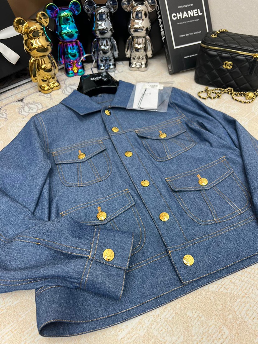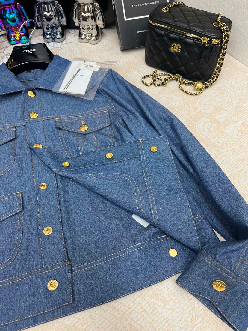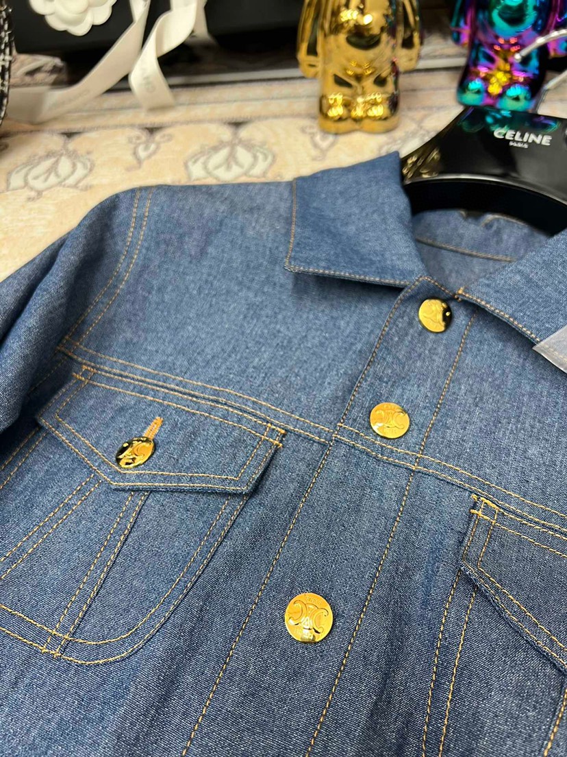 • New Celin 2023 Pre Autumn New Double Pocket Metal Buckle Thin Denim Shirt