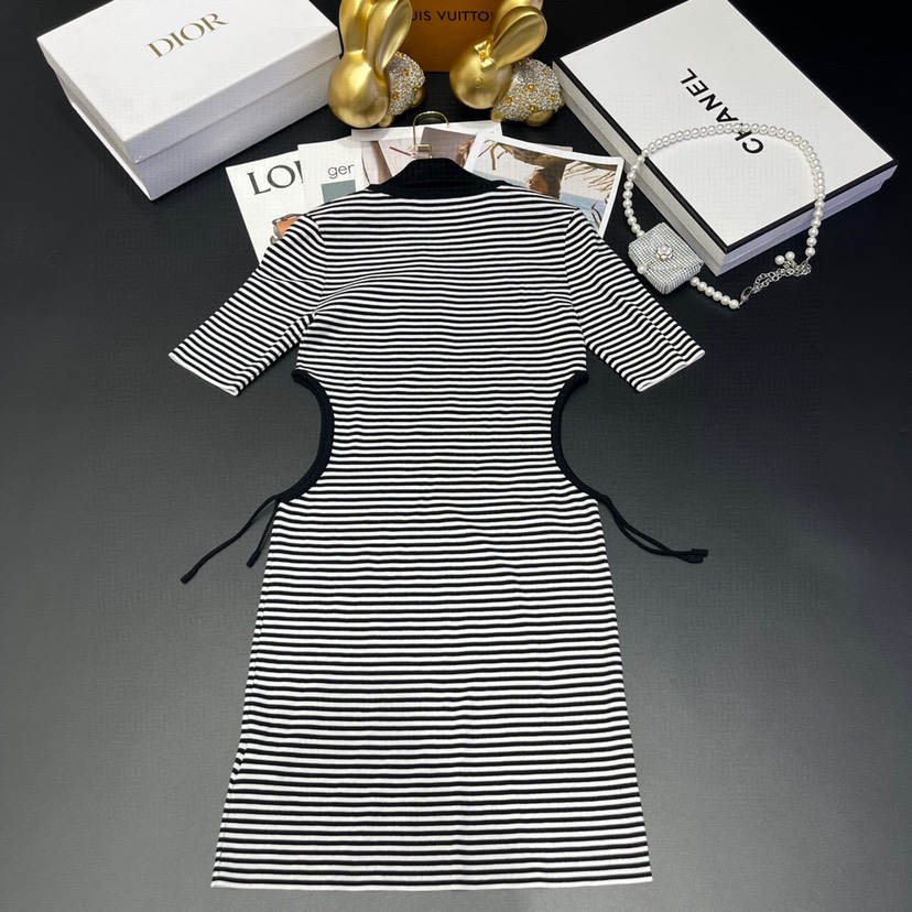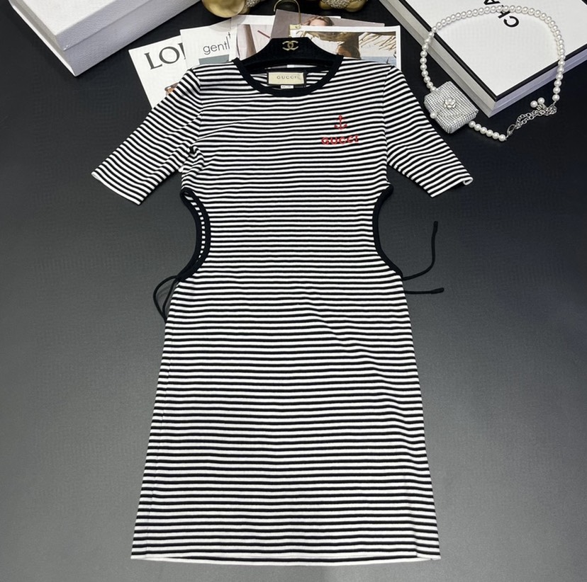Gucci23 Spring/Summer New Colorblock Stripe Hollow Waist Letter Knitted Dress Color: Black Size: s.m.l